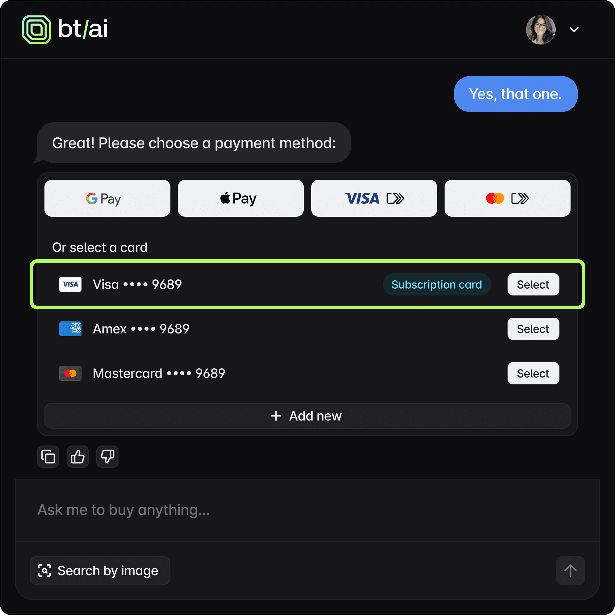 Embed checkout into any agent UI or chatbot.