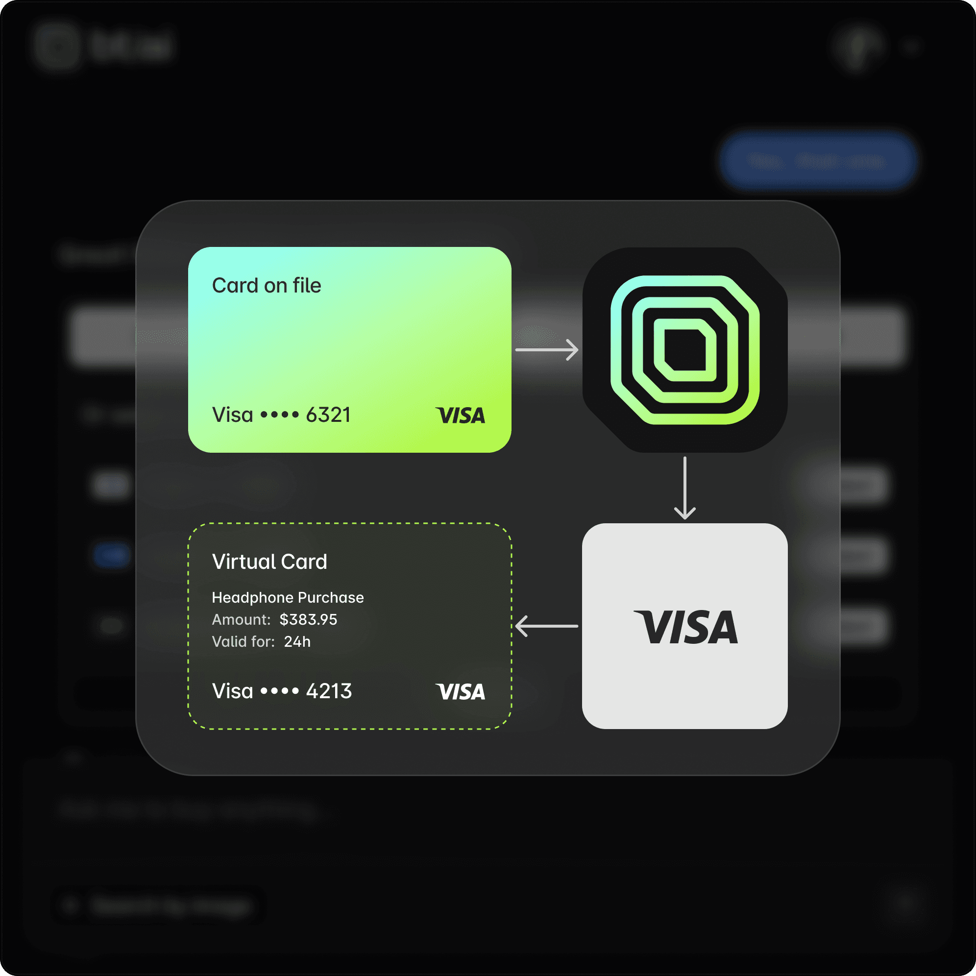 A virtual card is generated with exact limits (amount, merchant, time), ensuring secure, single-use payment for agent use.